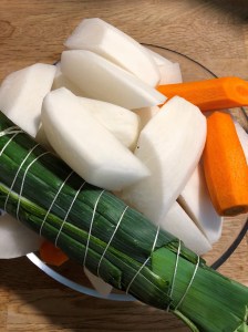 Pendant ce temps, préparer les autres légumes : éplucher les pommes de terre, les navets, les carottes et les couper en 4. Laver et attacher les verts des poireaux à l’aide d’une ficelle de cuisine, nettoyer la côte de céleri et les oignons.
