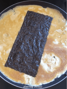 3. Versez une nouvelle fine couche d’œufs. Ajoutez une feuille d’algue (et/ou les ingrédients que vous aurez choisis).