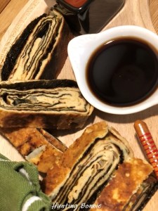L’omelette japonaise est souvent nature, mais peut également contenir d’autres ingrédients pour lui apporter plus de gourmandise, comme la sauce de soja, le mirin, le dashi, les algues nori, etc. Personnellement, j’aime généralement l’agrémenter de cébettes finement émincées, de champignons noirs ou shiitaké, de coriandre fraiche et de graines de sésame noir. Toutefois, chacun a sa propre recette, ajustant le dosage ou les ingrédients à ses goûts. De mon côté, je n’aime pas lorsqu’elle est trop sucrée, à savoir, c’est habituellement signe d’une version industrielle.