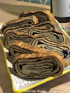 L’omelette japonaise est réalisée par plusieurs fines couches de la préparation, ce qui crée sa forme si particulière. Au fur et à mesure de la cuisson, on ramène la pellicule de l’omelette cuite sur le bord de la poêle en la roulant, pour laisser les œufs battus en omelette s’étaler par fines lamelles successives. On obtient donc un rouleau, qu’on mettra en forme à l’aide d’une natte à sushi (ou, comme moi, du film alimentaire). Il sera bien serré et facile à couper avant de la débiter en tranches pour la présentation et le service.