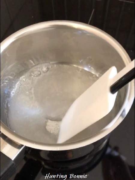 - Dans une casserole, portez à ébullition le sucre avec 3 CS d’eau. Stoppez aux premiers bouillons et incorporez la gélatine préalablement ramollie dans de l’eau froide, remuez et réservez.