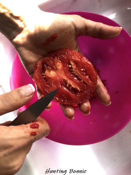 - Lavez et émondez les tomates : incisez la peau en croix et plongez-les 1 minute dans de l’eau bouillante puis dans l’eau froide. La peau se retire toute seule !