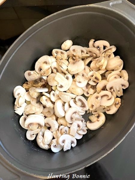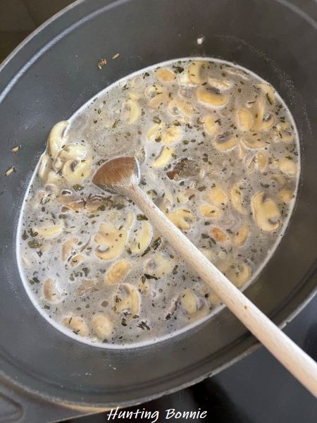 2. Faites fondre le beurre dans une cocotte. Ajoutez la majorité des champignons (gardez en 6 CàS de côté), l’ail et le thym.