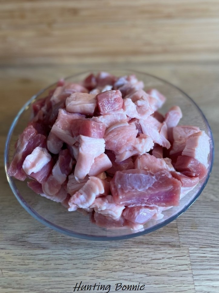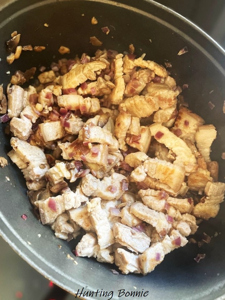 - Dans une cocotte, sans graisse, faites revenir la poitrine de porc coupé en morceaux d’1 cm.