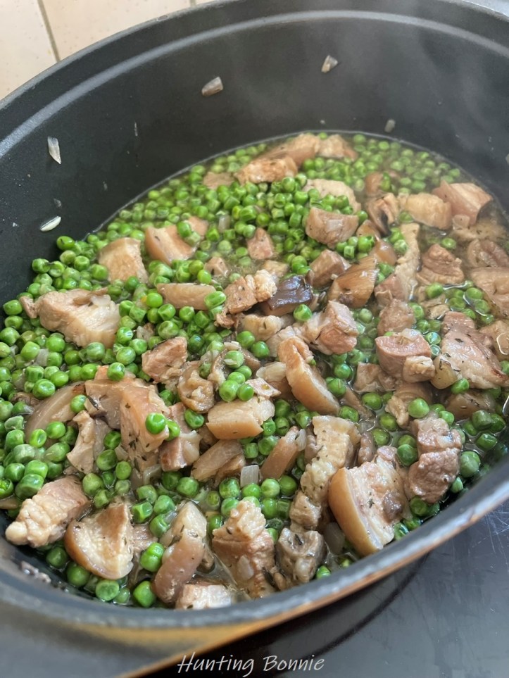 - Dans la cocotte précédente, ajoutez les petits pois (au préalable décongelés si le cas), poursuivre la cuisson 35 min. Ajoutez les pommes de terre, poursuivre 10 min. (Les petits pois doivent être tendres et la viande fondante).