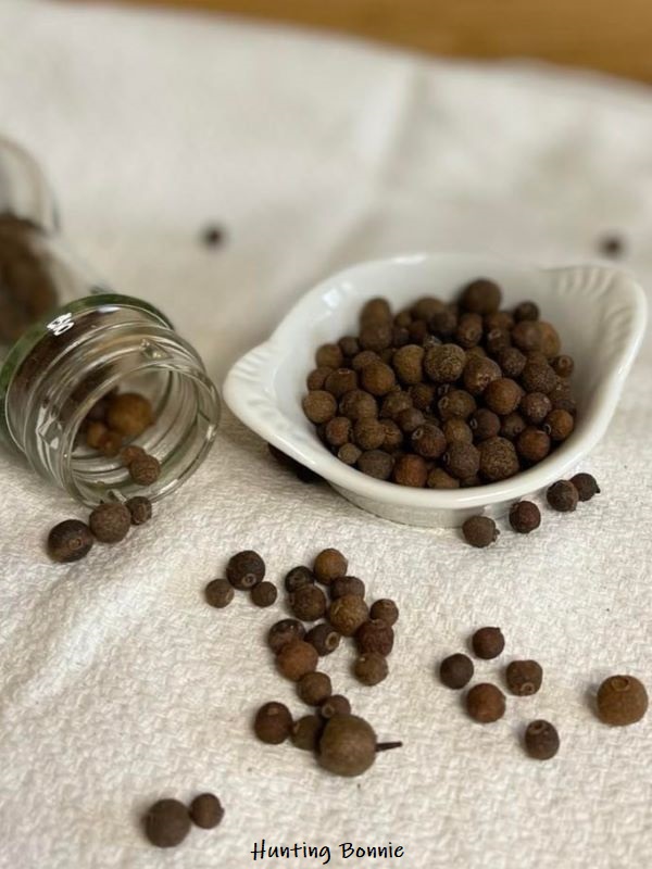 Pour moi : 2 bocaux avec des baies de genièvre et 1 avec le piment de Jamaïque de l’Herbier d’Auvergne - 1 C.à.S de sel