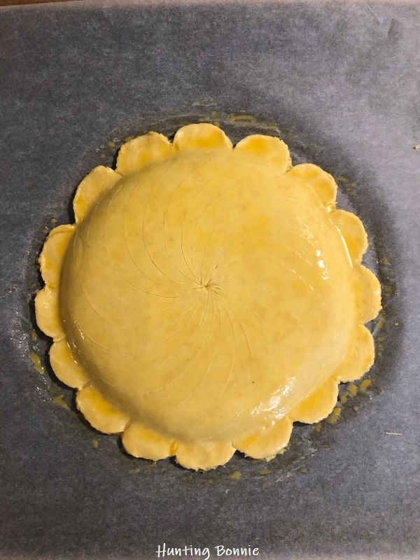 - Dorez la pâte avec l’œuf battu à l’aide d’un pinceau et chiquetez la pâte en réalisant des petites entailles au couteau sur tout le pourtour.