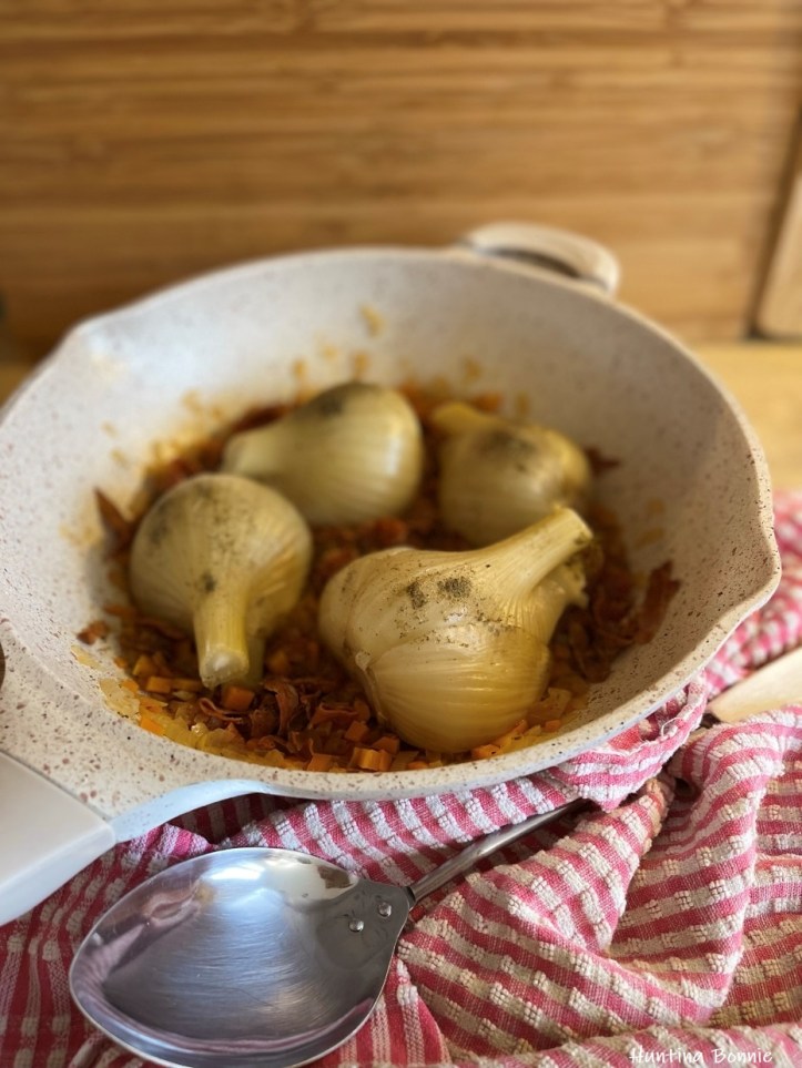 - Ajoutez les oignons, les carottes, les gousses d’ail et laissez saisir encore 5 min à feu moyen fort.
