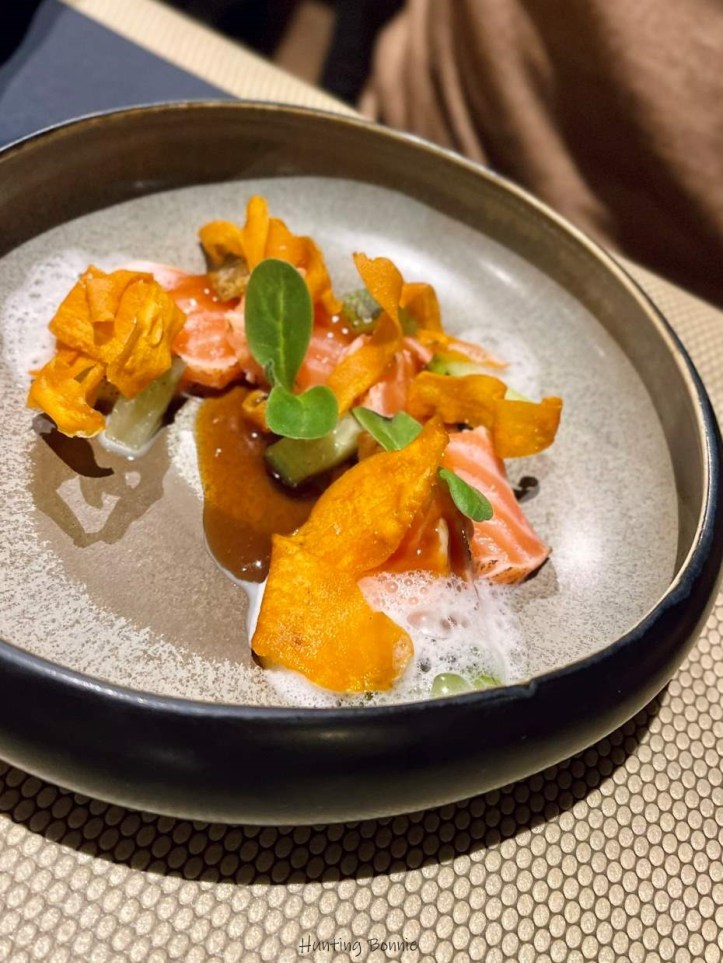 - Le Tataki De Saumon À La Flamme, Concombre Brûlé, Gel Ponzu Et Écume Anis