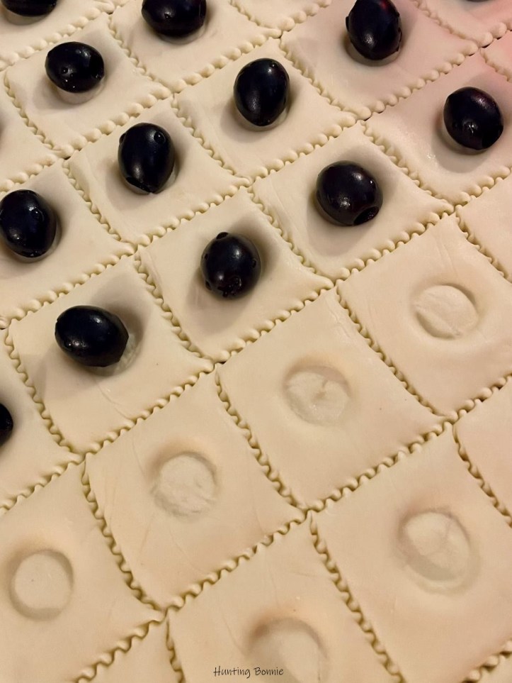 - À l’aide du dos d’une cuillère ou d’un petit ustensile, réalisez une empreinte au centre de chaque carré. Badigeonnez-les avec le jaune d’œuf, puis déposez une olive sur chaque empreinte et parsemez d’herbes de Provence.